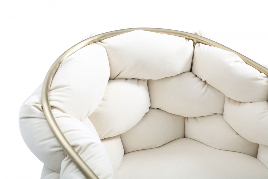 A fabulous cushy chair is what awaits you with the Modrest Debra Modern Green Fabric Dining Chair. Giving you a glimpse of what future furniture design can be, this dining chair comes with brushed brass frame and rod-shaped legs. The back takes a semicircular shape to include the armrests. To create the back part, the metal was created like blocks that are left open, with only thin braces separating the blocks. A dense cushion upholstered in white velour was stuffed into the open spaces so you get to relax your back in its softness. This amazingly designed modern dining chair will bring a new freshness into your dining room that can also double as an accent piece.