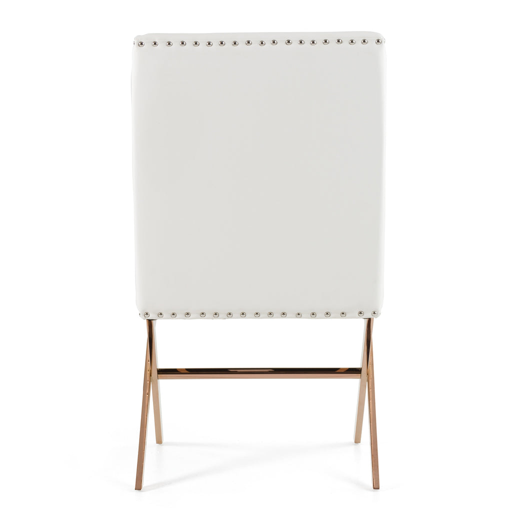 Brimming with modern style is the Alexia Dining Chair. Framed in rose gold steel and wrapped in sleek white vegan leather, this dining chair features a wing back that descends downwards to the full seat. Contemporary nailhead trims adorn the edges of the seat and the back. A crossbar fortifies the support of the X-shaped Rose gold steel legs. This classy dining chair can also function as an accent or office chair.