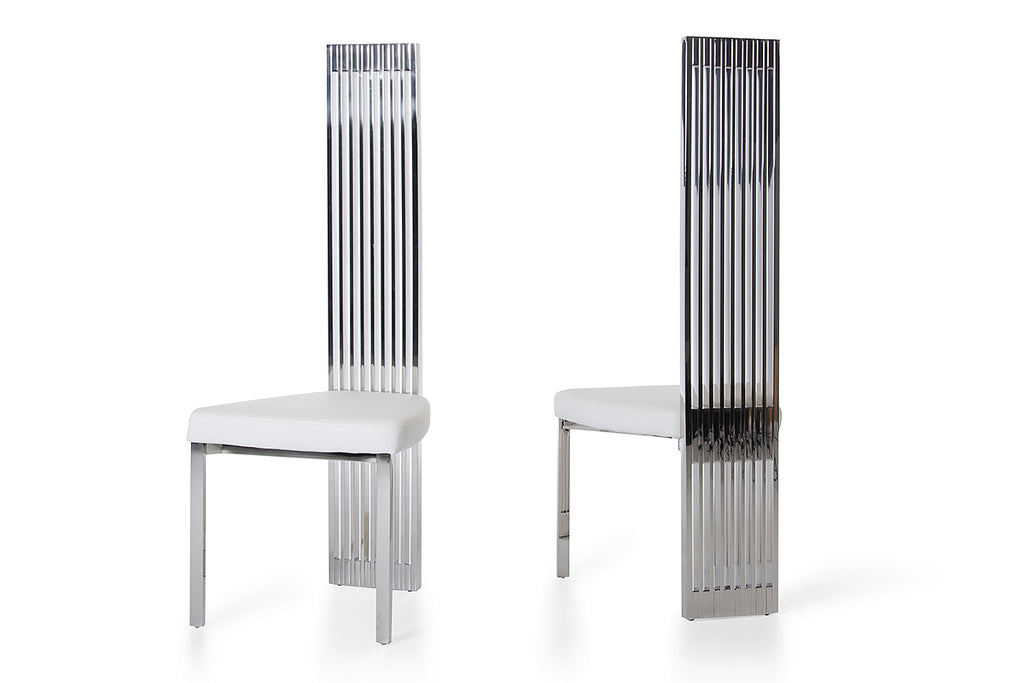 The Elise Dining Chair is the perfect chair for a dramatic dining experience. Extra tall chair backs create visual interest and stimulation. A stainless-steel frame pairs effortlessly with a white vegan leather upholstery, creating symmetry and balance. Pair with a white and glass dining table for a perfect pair.