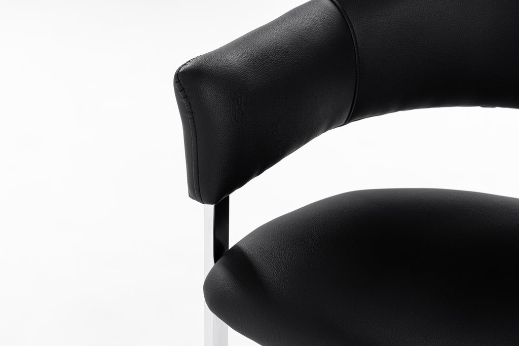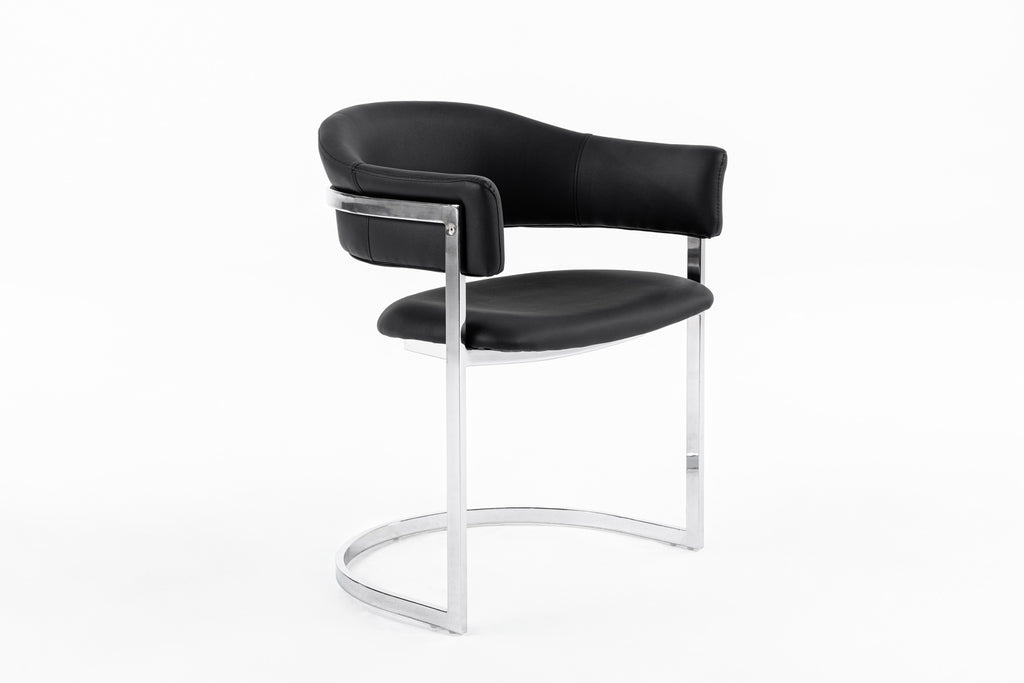 The Modrest Allie Contemporary Black Leatherette Dining Chair features luxury black leatherette upholstery in a sturdy stainless steel frame with a semi-circle base. This black leatherette dining chair is also available in white.