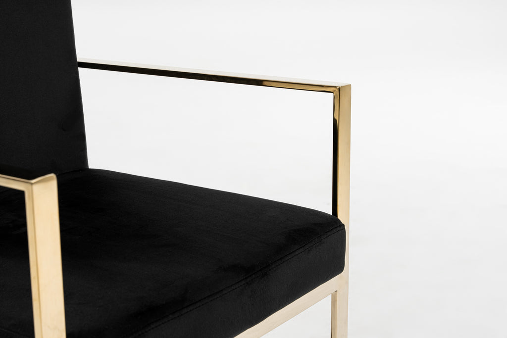 The Fowler Dining Chair is a simple velvet dining chair with an elegant frame and beautiful upholstery. The black velvet cushioned upholstery of these dining chairs make them comfortable and elegant. Sure to turn heads with the champagne gold stainless steel exposed frame. It is the perfect addition to your glam home.