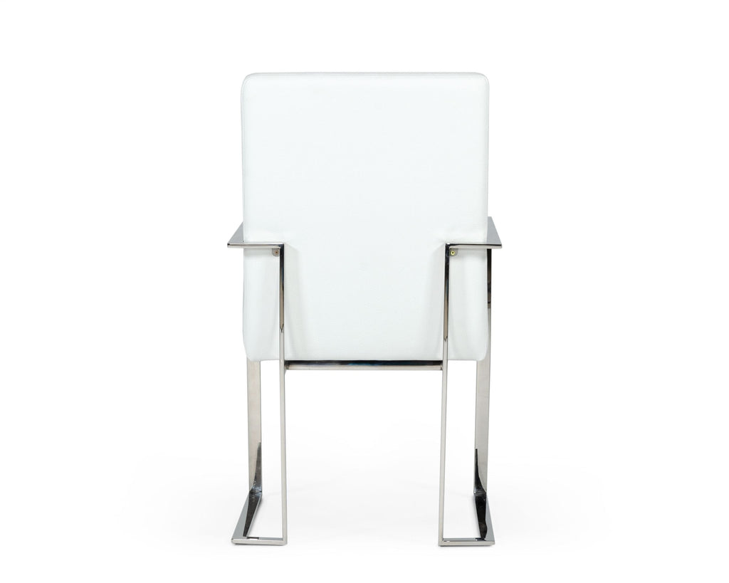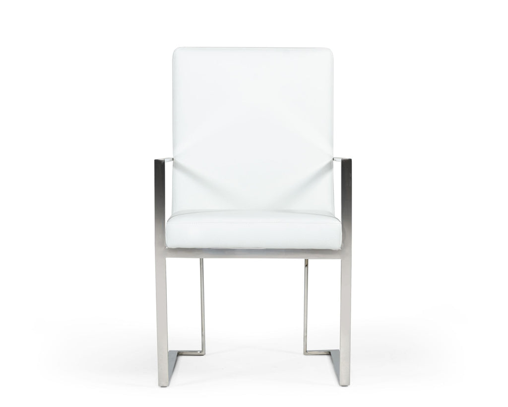 The Fowler Dining Chair is a simple leather dining chair with an elegant frame and beautiful upholstery. The white eco-leather cushioned upholstery of these dining chairs makes them comfortable and elegant. Sure to turn heads with the brushed stainless steel exposed frame. It is the perfect addition to your glam home.