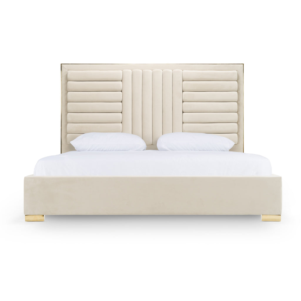 Upholstered In Beige Velvet Fabric Channel tufting details on Headboard Slats Included No Box Spring Required Polished Champagne Gold finished metal legs and accents Assembly Required
