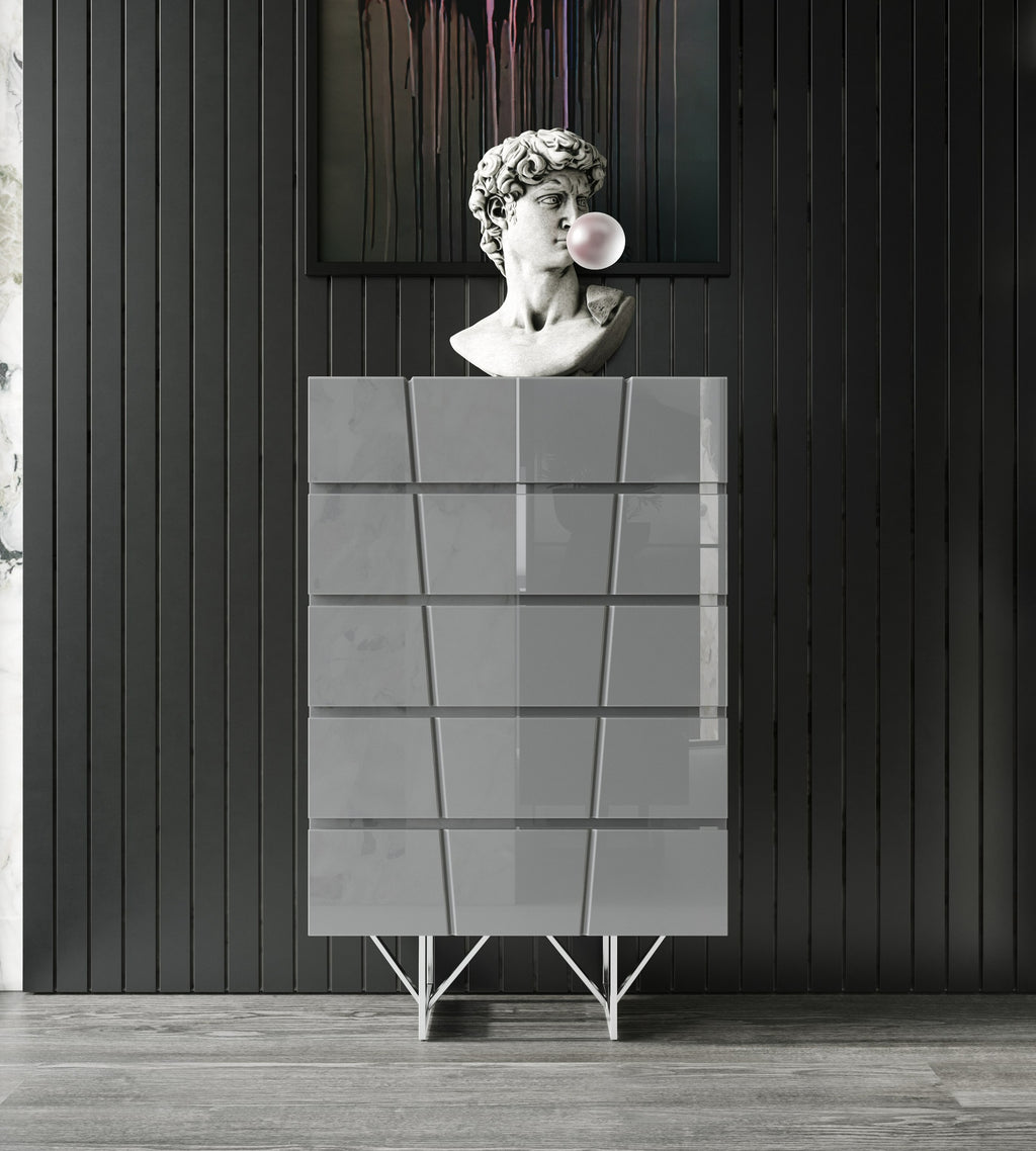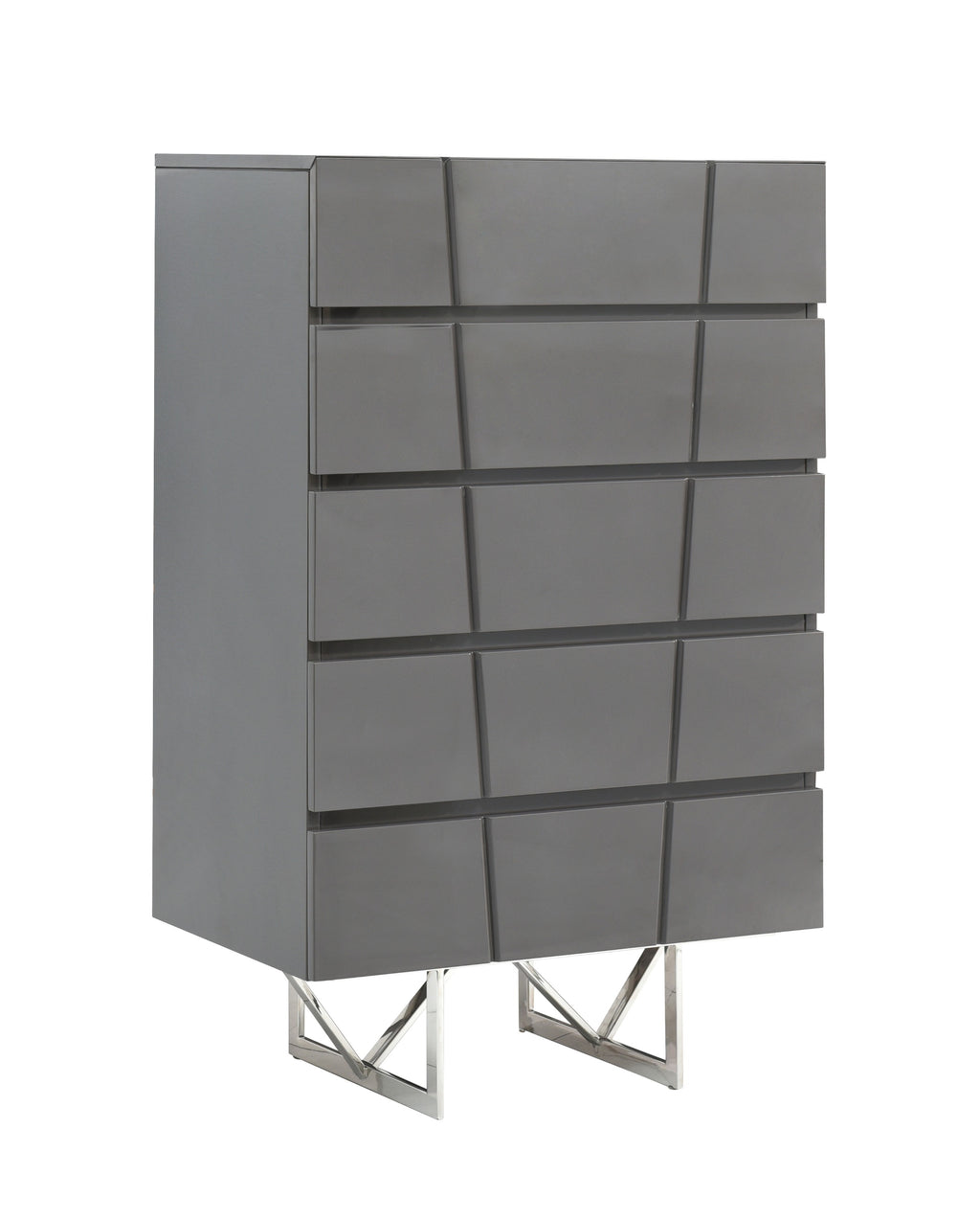 Poised and clean lines embody the Modrest Chrysler Modern Grey Chest. Featuring a lustrous grey gloss finish, it comes with 5 easy-to-slide spacious drawers. Giving it an impressive look are the grooves on the top that extends to the drawer fronts. Polished triangular and square stainless steel legs keep this modern chest off the floor and also complete its impressive stance.