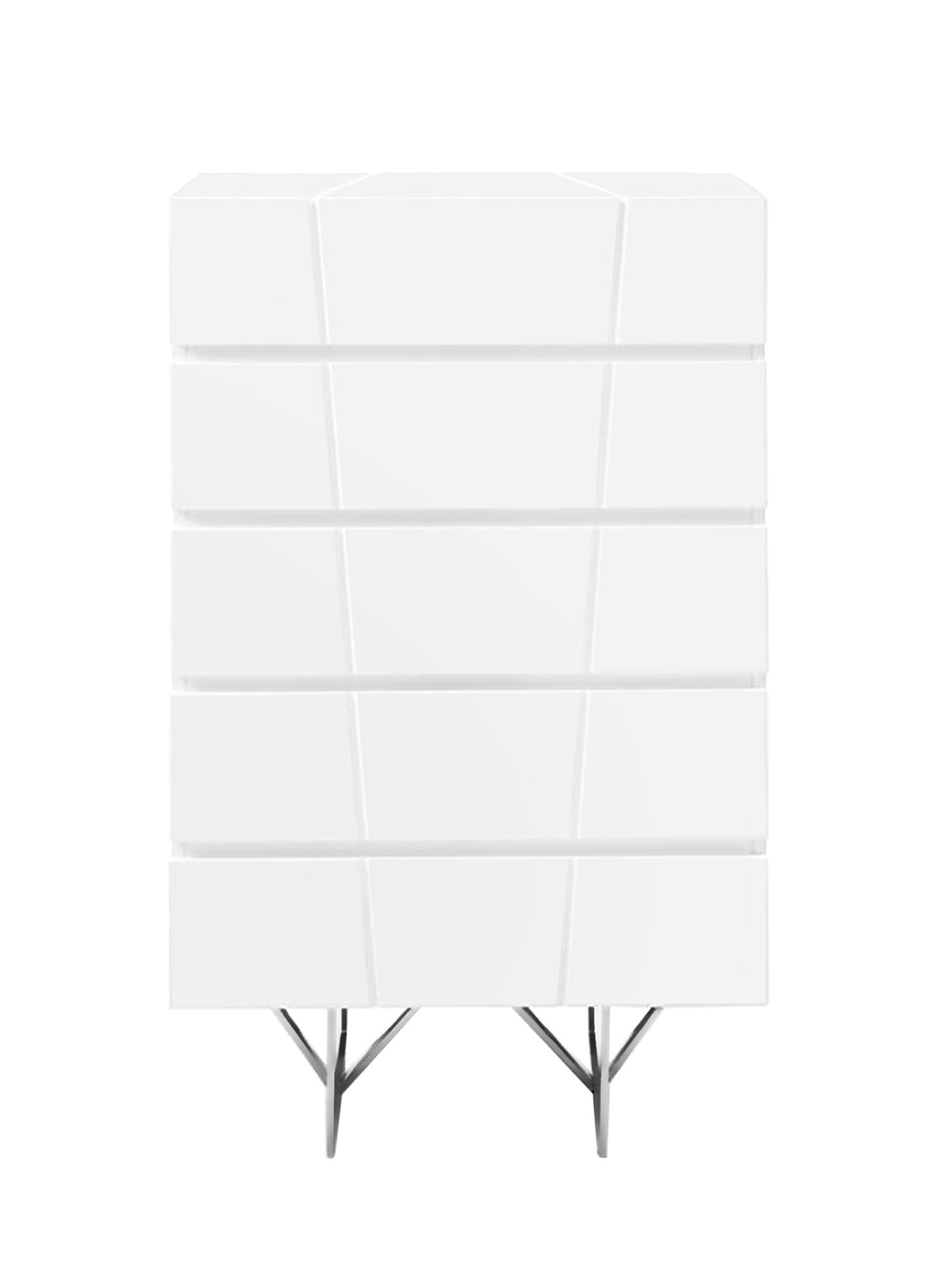 The Chrysler Chest supports your modern needs in every way. Adding luster to its boxy structure is the suave high gloss finish punctuated with diagonal cutouts. Fitted with five drawers that glide easily and close quietly, this chest keeps essential items nearby. Stainless steel hairpin legs finish this lovely piece to complete the mod styling.