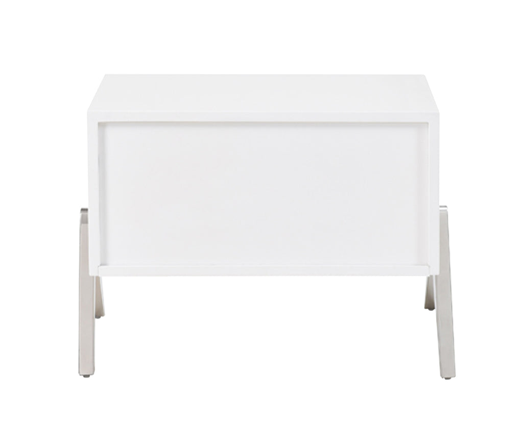 The Modrest Candid Modern White Nightstand presents a winsome style featuring a dainty white high gloss finish. Fitted with a single drawer with a linear front design, it stands on durable upside-down V-shaped stainless steel legs. Requiring no assembly, this modern nightstand has a dimension of W26" x D17" x H19".