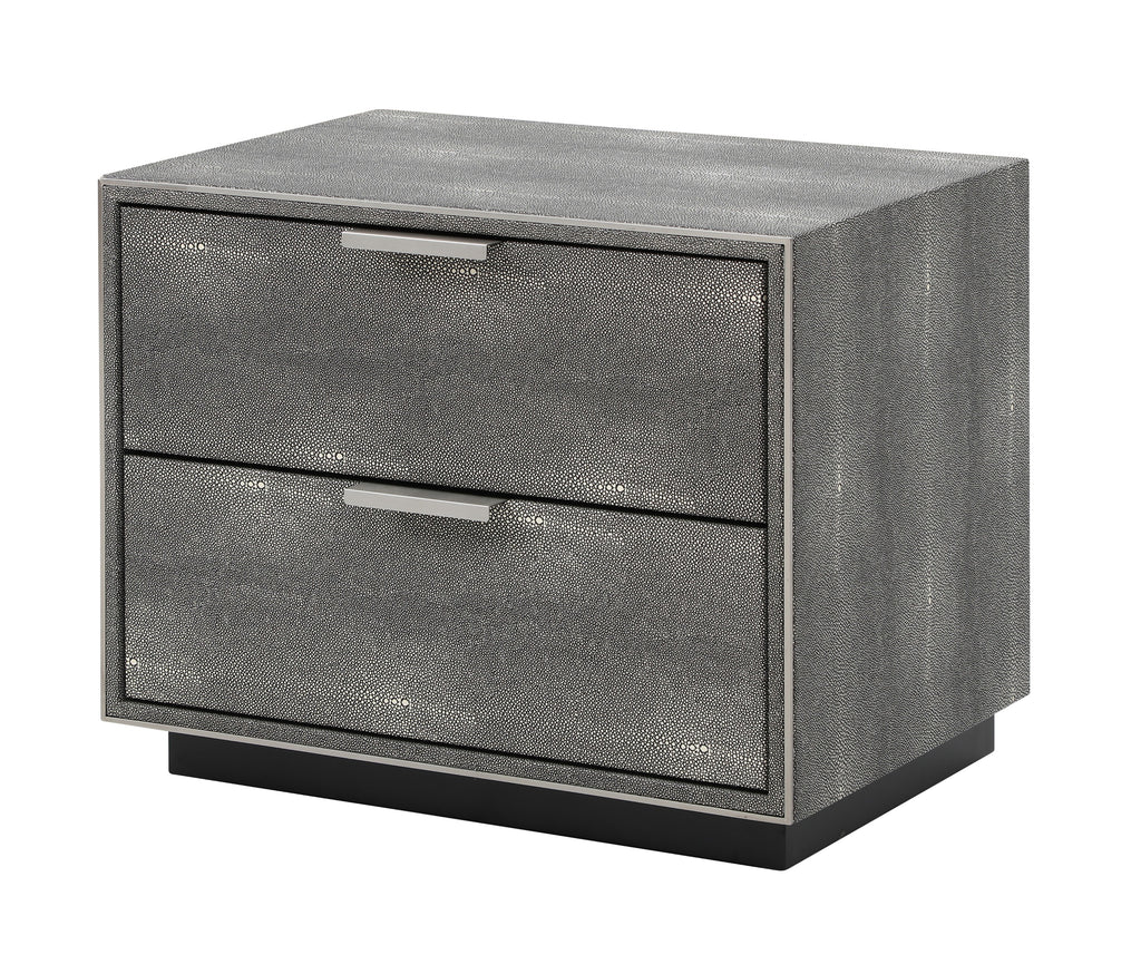 Two Drawers Roller Glides Soft Closing Mechanism Dark Shagreen Veneer Brushed Black Stainless Steel Handles and Accents Metal may appear to be different colors due to reflection of surroundings Drawer Weight Capacity: 44lbs