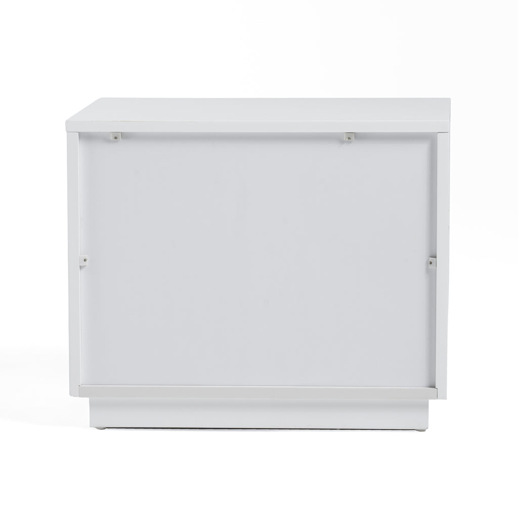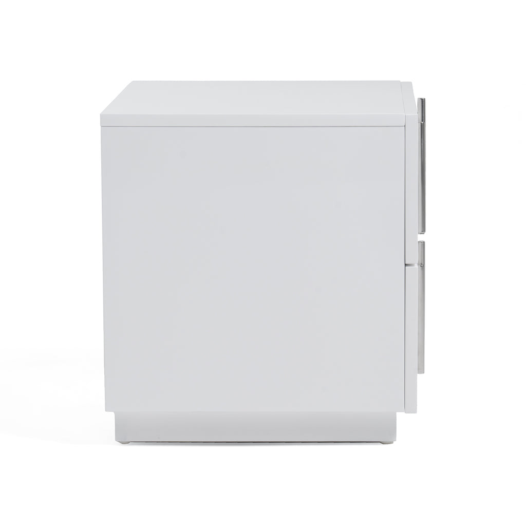 Featuring two spacious drawers and bold style, this square nightstand will bring modern design to any bedroom. Using a white high-gloss finish, this table blends with any decor while standing out as a quality piece of furniture, highlighted by the interesting stainless-steel handles. The vertical style of the handles is striking, and give the entire nightstand a very different, modern style all of their own.