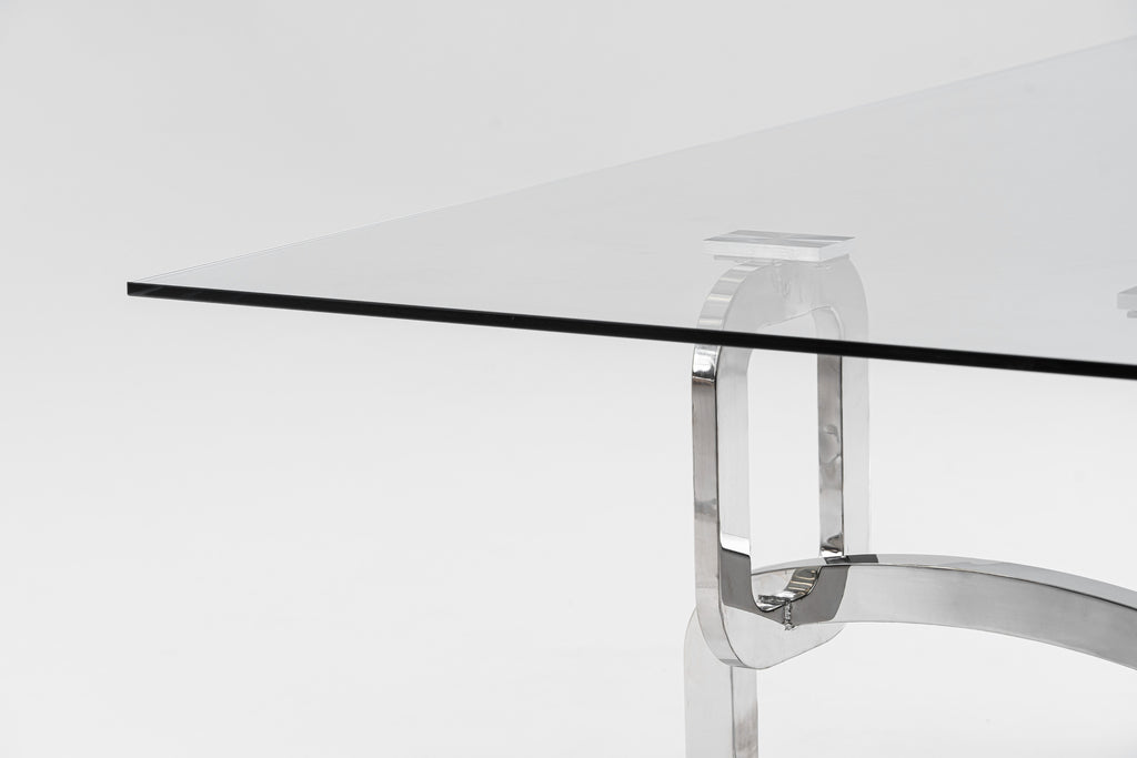 The Modrest Adelaide Modern Stainless Steel & Glass Dining Table is an elegant display of artistry. An eye-catching stainless-steel base with abstract architecture creating a unique and stylish piece. A glass top floats on the top of this enchanting base elevating this to a luxury table. Pair with a white vegan leather dining chair for s striking styling that is sure to impress.