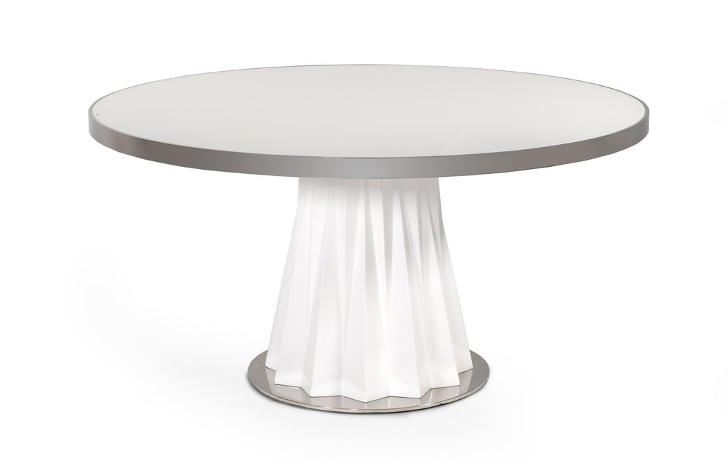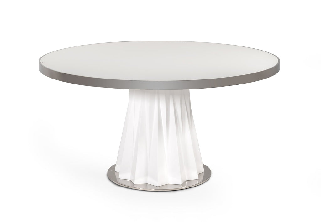 Highlight the modern décor of your dining room with the Modrest Cabaret Modern White Round Dining Table. Framed in polished stainless steel frame is the round 4mm white glass top that was complemented by the white high gloss finished pedestal base. The unique base was designed to look like a series of prisms put together stands on a round burnished high gloss finished pedestal base. Adding to the visual appeal of your dining room, this stylish and chic modern dining table seats 4 comfortably and requires some assembly.