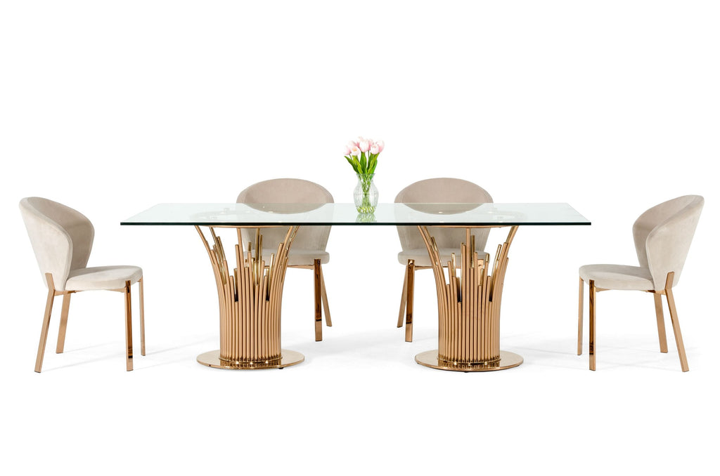 Make a statement in your dining space with the Modrest Paxton Modern Glass & Rose gold Dining Table. Featuring a chic modern design, this table features a rectangular 15mm clear tempered glass top perched on a Rose gold stainless steel base. The base designed like a big vase has the steel on the lower level fastened together while the upper level has the steel in different sizes so there are open spaces, giving it a buoyant feel. Completing its overall look is the round platform where the base stands. Accommodating 6-8 comfortably, this modern dining table will make your dining room even more classy and inviting by placing a low potted plant or flower arrangement as a centerpiece.