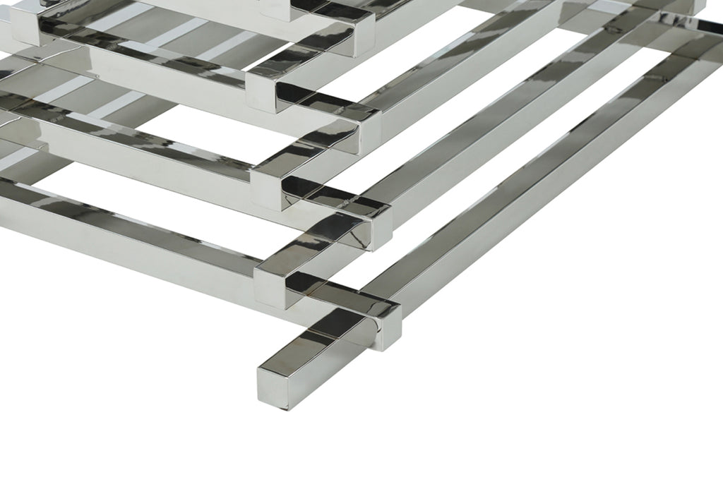 Stacked, asymmetrical stainless-steel bars ascend in an hourglass shape to create this dramatic figure. The Crawford Dining Table is a perfect modern or minimalistic design that stars in your dining room. Pair it with white vegan leather dining chair for a clean look or add a bold colored velvet tufted chair for a glam look.