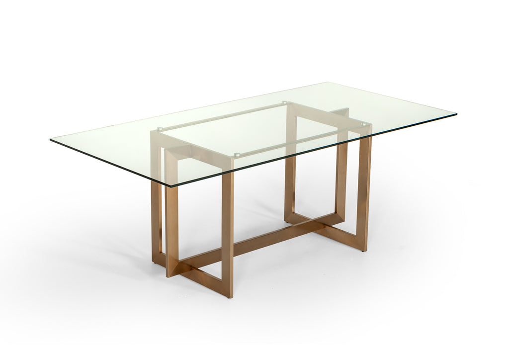 The Modrest Keaton Modern Glass & Brass Dining Table is a picture of charm and gracefulness featuring a rectangular 12mm clear tempered glass top that rests on a sturdy brushed stainless steel frame with lustrous brass finishing. It has a dimension of W79" x D39" x H30" and seats 6 persons comfortably. The Chrysler Buffet included in the picture is available separately. No matching chairs are available.