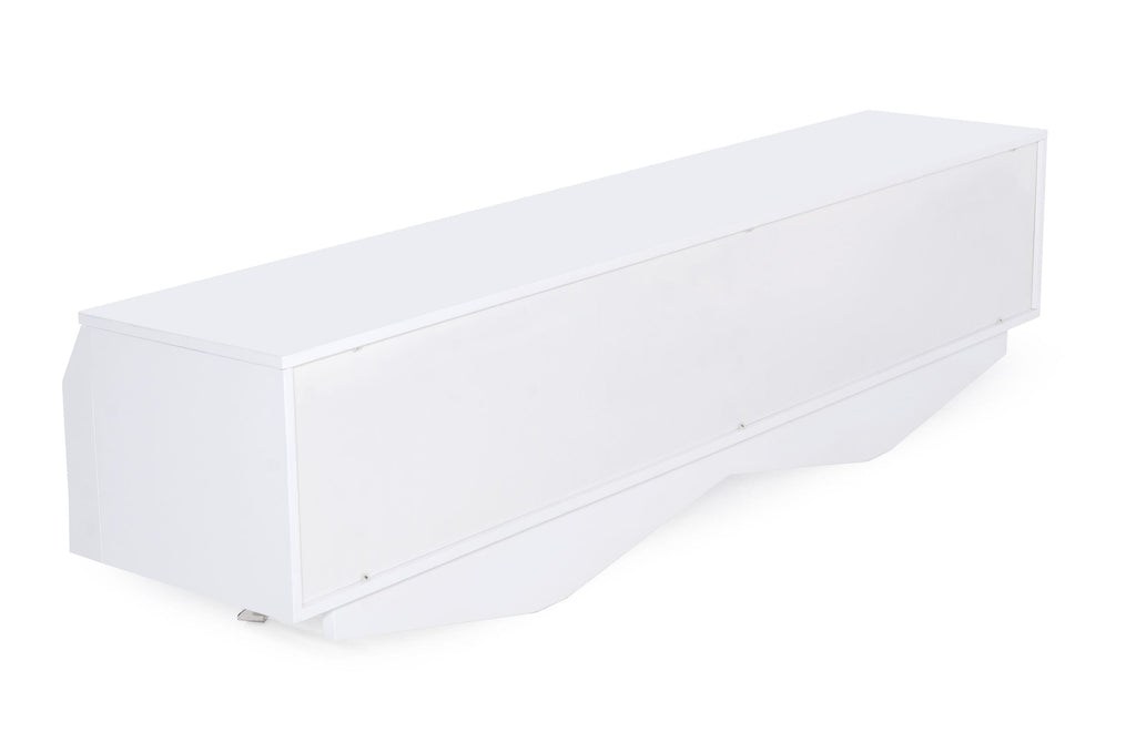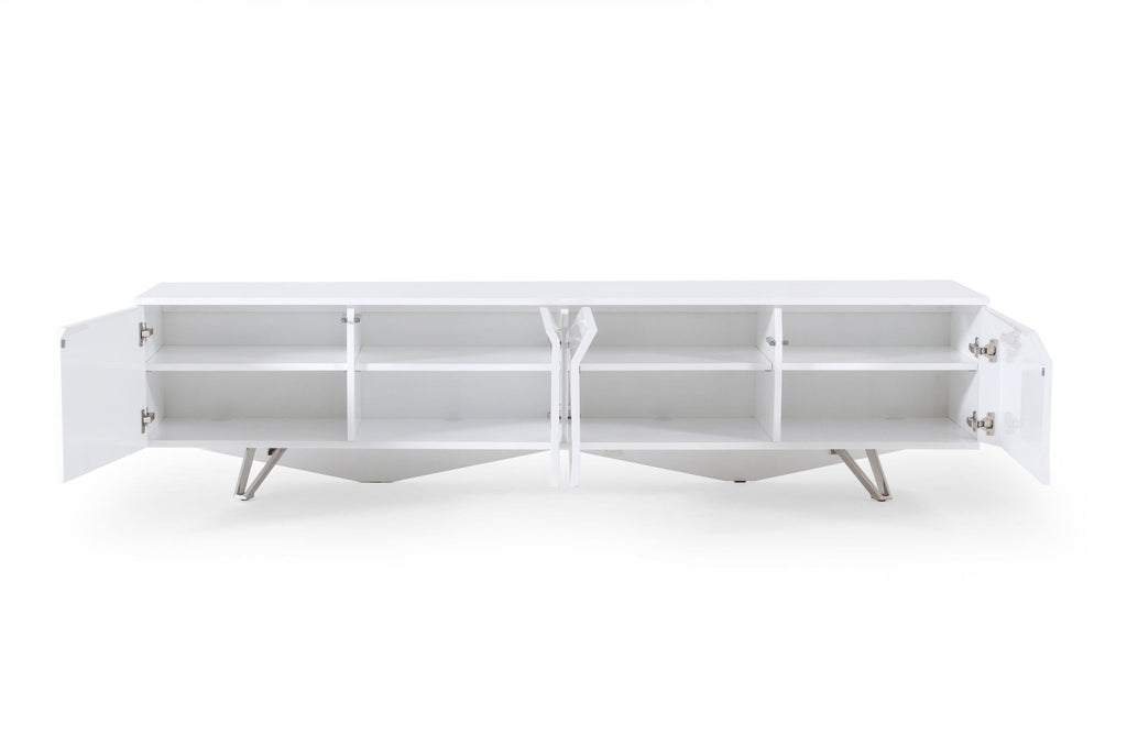 The soft-lined white gloss Columbia TV Stand will brighten up your living space or office space if you prefer and offer this sleek contemporary look. There are four doors that open up to 4 shelves and 8 compartments for storage space with stainless legs.
