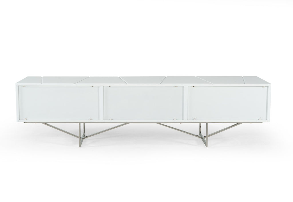 Bring a striking addition in your living space is this rectangular Modrest Chrysler Modern White TV Stand. Glistening in a white high gloss finish, it comes with 3 awe-inspiring drawers with oblique notches on top and drawer fronts. Square and triangular shaped legs provide support to this beauteous modern TV stand.