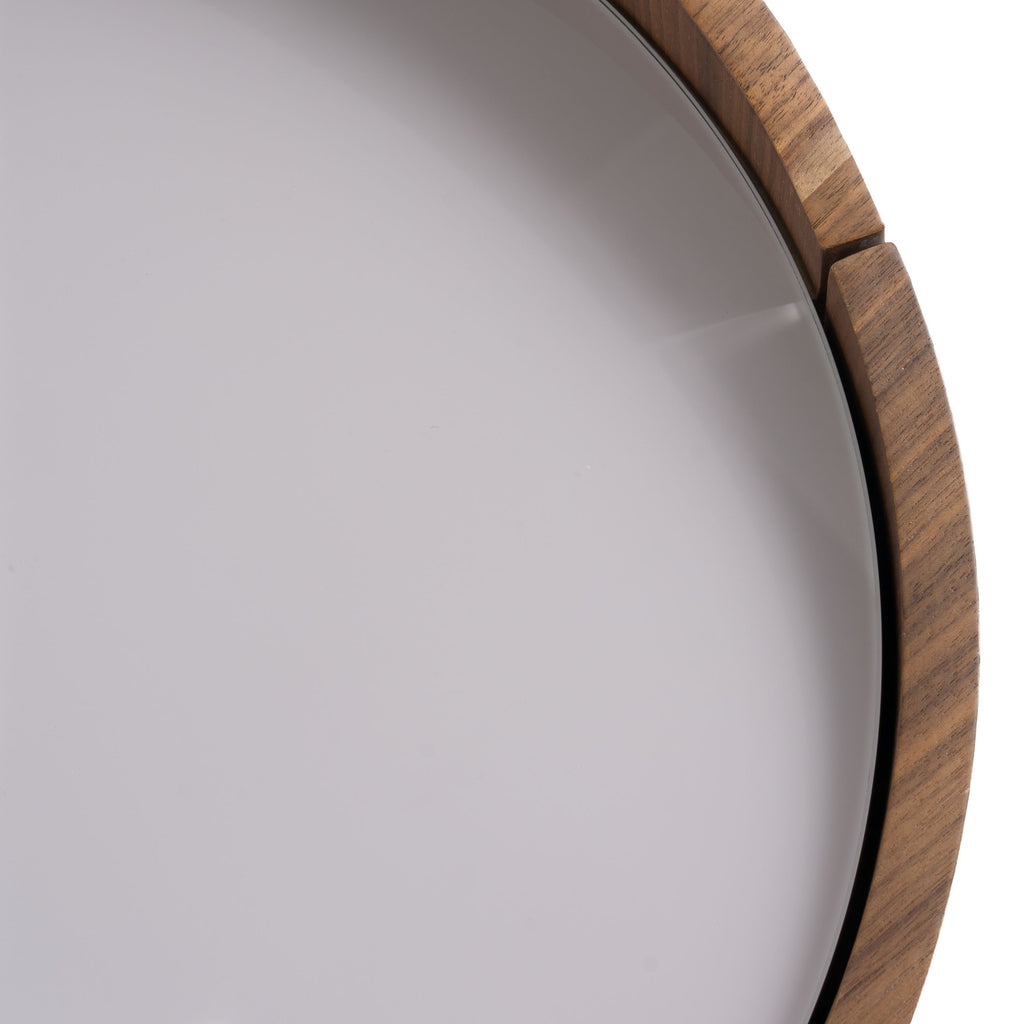 The Geneva Nightstand is the perfect contemporary table for your living space. The round piece has a walnut melamine finish that highlights its simple lines. The top is made of a grey painted tempered glass that is inset within the frame. Perfect for a neutral modern space.