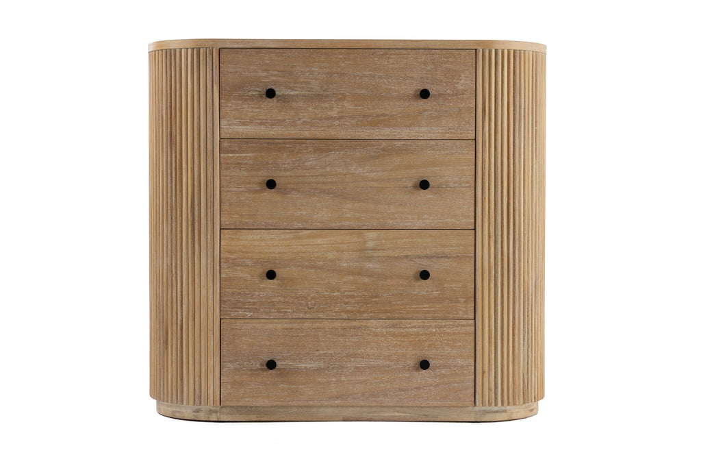 The Modrest Jacobson Modern Natural Acacia Chest exudes a sleek, contemporary charm with its rounded edges and textured, ribbed surface. Crafted from natural acacia wood, it features a warm that complements diverse decor styles. With four spacious drawers adorned with minimalist black knobs, it offers both functionality and aesthetic appeal. This chic chest is perfect for adding a touch of modern elegance to any bedroom or living space, harmonizing style with practicality.