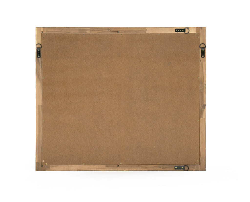 This contemporary mirror is constructed out of a solid acacia frame and finished with a warm, blonde walnut finish.
