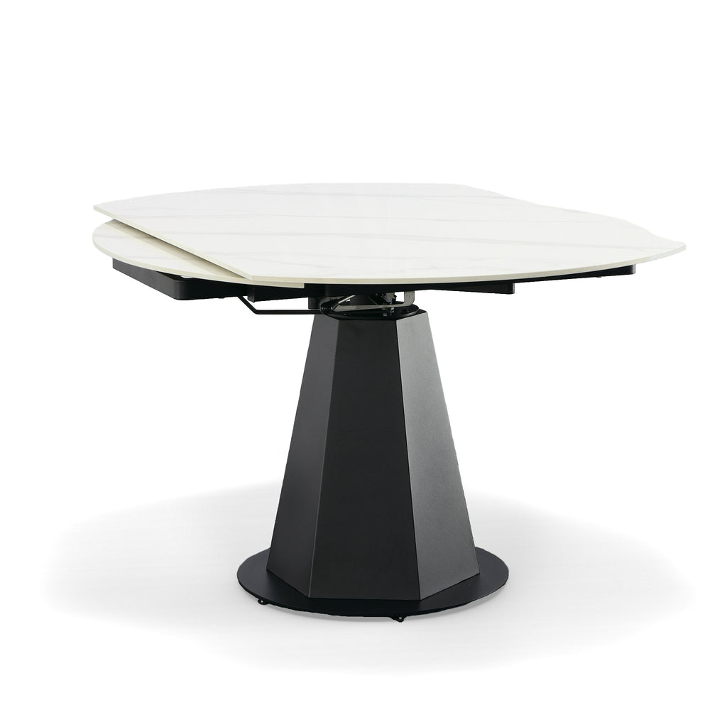 The Modrest Barela dining table combines modern aesthetics with practical functionality. Its black and white ceramic top exudes elegance, resembling luxurious white marble. Supported by a sturdy black iron pedestal base, this rectangular table comfortably seats 4, and when fully extended, it accommodates up to 6 guests. Whether hosting an intimate dinner or a larger gathering, the Modrest Barela offers both style and versatility