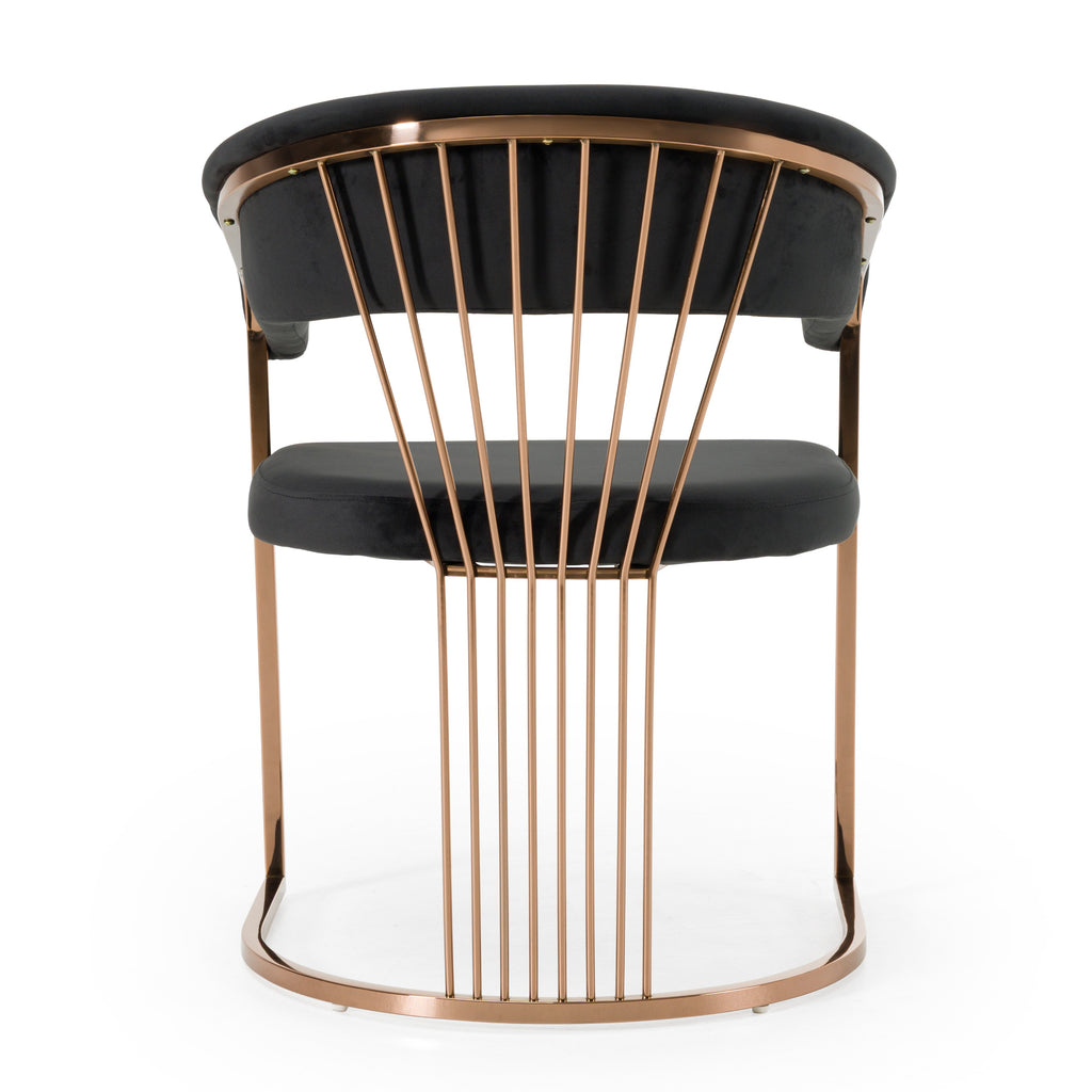 Introducing the Modrest Linda Modern Black Velvet and Rosegold Dining Chair! This stunning chair effortlessly combines style and comfort, making it the perfect addition to your dining space. Its sleek design features a luxurious black velvet upholstery that adds a touch of elegance to any room. The rose gold metal legs provide a chic and modern flair, while also ensuring durability and stability. With its ergonomic shape and plush cushioning, you'll experience unparalleled comfort during long meals and gatherings. Whether you're hosting a dinner party or enjoying a cozy family meal, the Modrest Linda Dining Chair is sure to impress your guests with its sophisticated design and exceptional comfort.