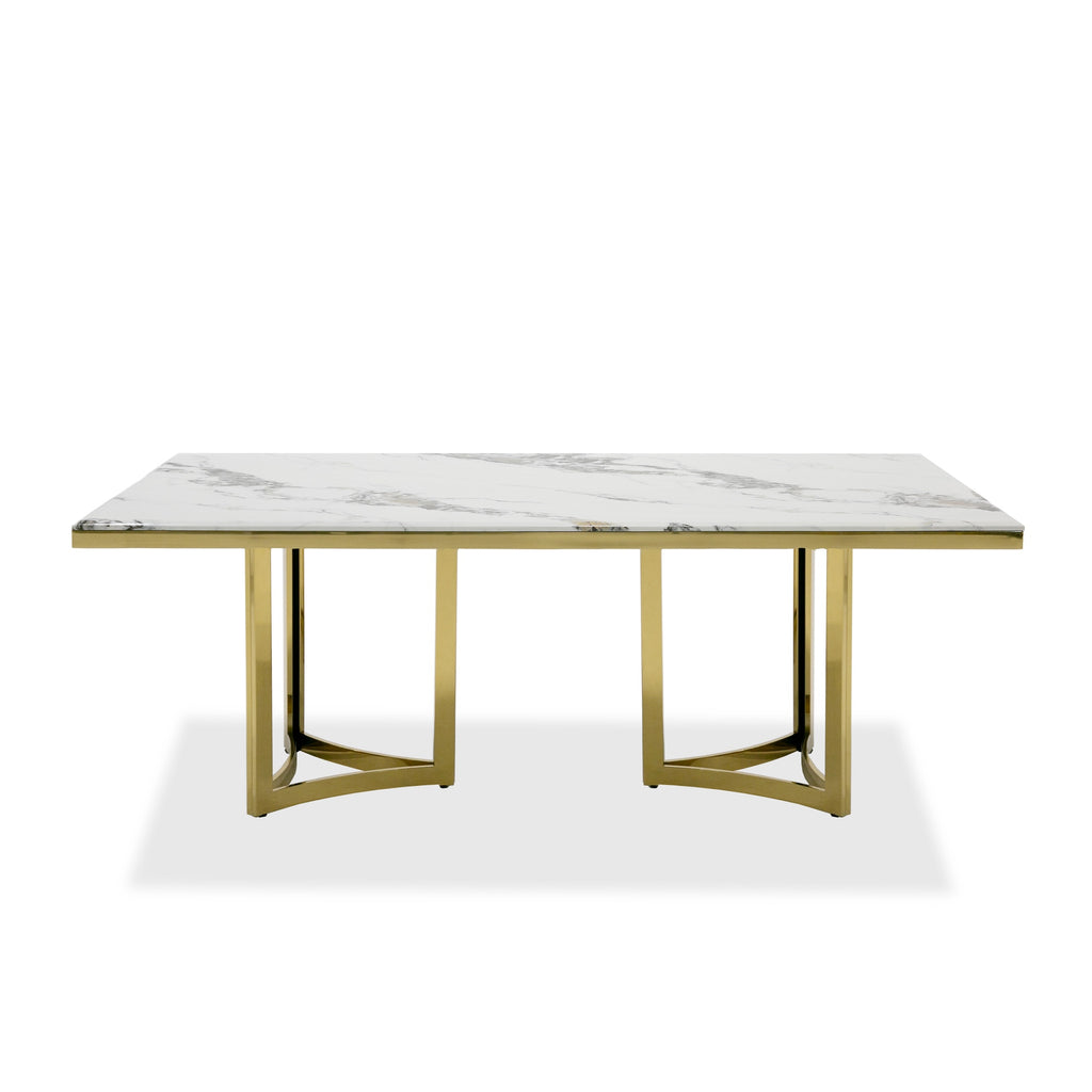 The Modrest Loomis dining table combines elegance and modern style. Its rectangular design features a 20mm white marble top, exuding sophistication. The gold stainless steel base with a double pedestal adds a touch of opulence. With ample space, it comfortably seats up to 8 guests.