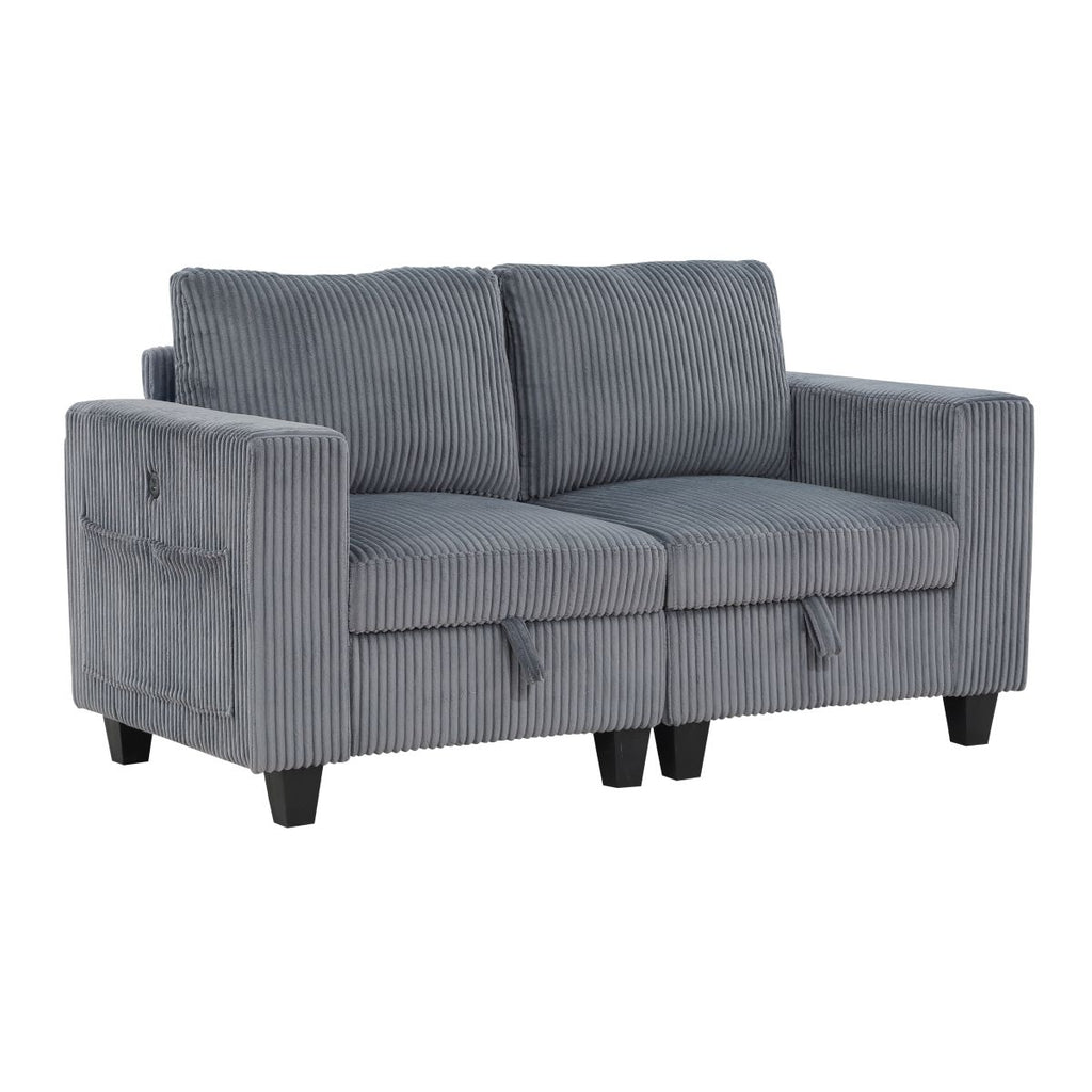 The multifunctional design of the Walterboro Collection creates a seating group that is not only configurable to your available space but serves as a convenient storage spot within your casual living room. Pull-out storage drawers are neatly tucked beneath the seats of the love seat, each drawer easily accessible with a pull to the front-mounted loop handle. The paired end seats arm's provide side support and power charging ports. The collection is covered in corduroy fabric for a neutral complement to your homes dcor.
