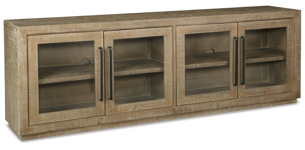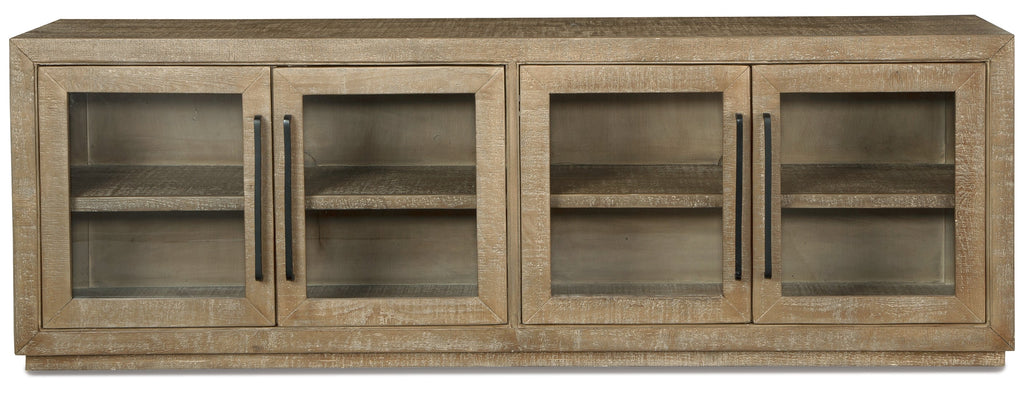 The clean-cut profile of this accent cabinet works equally well in casual and contemporary settings. Its distressed brown finish has an enduring charisma, with a wire-brushed effect highlighting the rich wood grain. Door pulls in a dark gunmetal finish add a sleek touch. With a warmly weathered appeal, this piece has a simple-yet-striking look that effortlessly pairs with your existing decor.