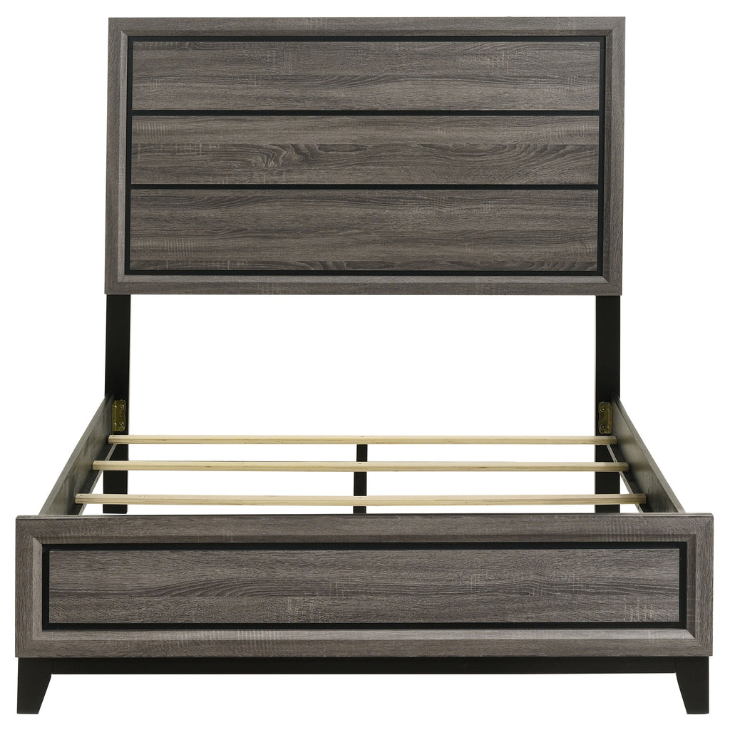 Bring a transitional California king bed into your sleeping space for exceptional style. The large single panel headboard is equipped with horizontal grooves for depth and dimension. The black and grey oak finish of this bed makes it an excellent option for all styles of bedrooms. With a low profile footboard and framed groove design, there is no shortage of style with this piece. Place it in your bedroom to create a warm and stylish appearance.