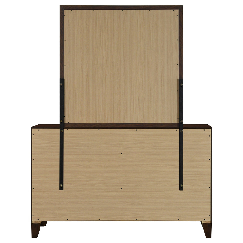 Straightforward style and clean lines highlight a modern six-drawer dresser with a framed mirror