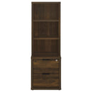 Enhance your home organization with this multifunctional bookcase, featuring a wood-inspired finish. Equipped with three open shelves and two drawers, it offers a mix of display and hidden storage options. The top drawer includes a secure locking mechanism for valuables, while an integrated dual USB charging outlet with USB-A and USB-C ports provides convenient power for phones and devices. Crafted from engineered wood with a scratch-resistant laminate veneer, this bookcase combines durability and modern functionality.