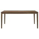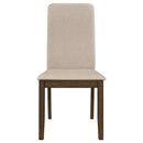 Perfect for a transitional style home, this five-piece dining set includes a minimalistic, rectangular table and four side chairs. The spacious, solid hardwood table features a warm walnut finish, also mirrored in each chair's exposed wood frame. Each chair offers a modern Parson style silhouette, and padded seats wrapped in a latte hued twill upholstery for each diner's comfort. With a neutral two-tone design, this dining set lends itself nicely to existing color palettes. Create a wonderful atmosphere for guests and family members to dine in with this simply, yet elegant furniture set.