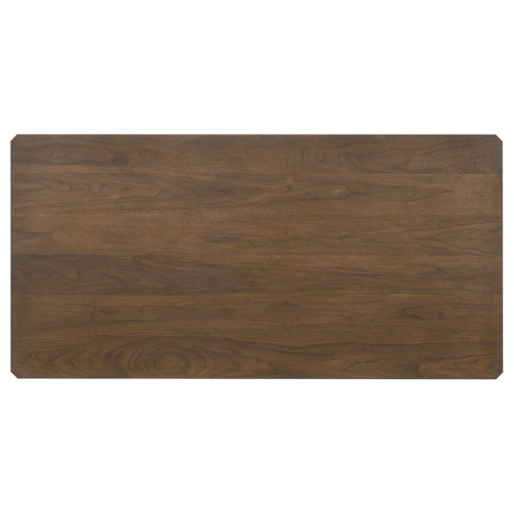 A sleek silhouette makes this wooden dining table a perfect choice for anyone who prefers a minimalist decor style. Slim, tapered legs support an expansive, rectangular tabletop to create a design that exudes simple glamour. A lightly beveled top with clipped corners adds just the right touch of understated style. A rich, medium walnut finish allows this beautiful piece to warm up a room. Crafted of Asian hardwood, this transitional dining table is exceptionally durable and built for lasting use.