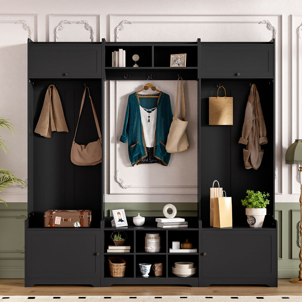 - All-in-One Storage Solution:Features 4 cabinets, 3 seating sections, 7 hooks, and multiple open shelves for maximum organization.