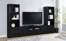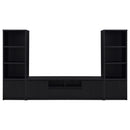 This modern entertainment center combines a sleek TV stand with two matching media towers, offering style and functionality. Finished in a bold black with a scratch-resistant eco-friendly laminate veneer, this unit provides ample storage and display options. The TV stand features cabinets, an open shelf with cable management, and a wide drawer, while each media tower includes open shelves and a bottom cabinet for organized storage. Perfect for creating a cohesive entertainment space in any living room.