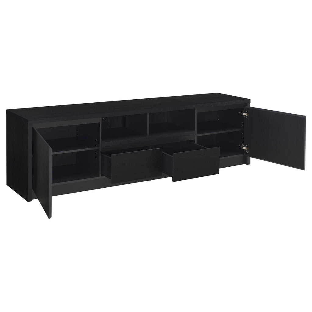 TV stand includes two spacious cabinets, an open shelf with cable management, and a wide drawer
