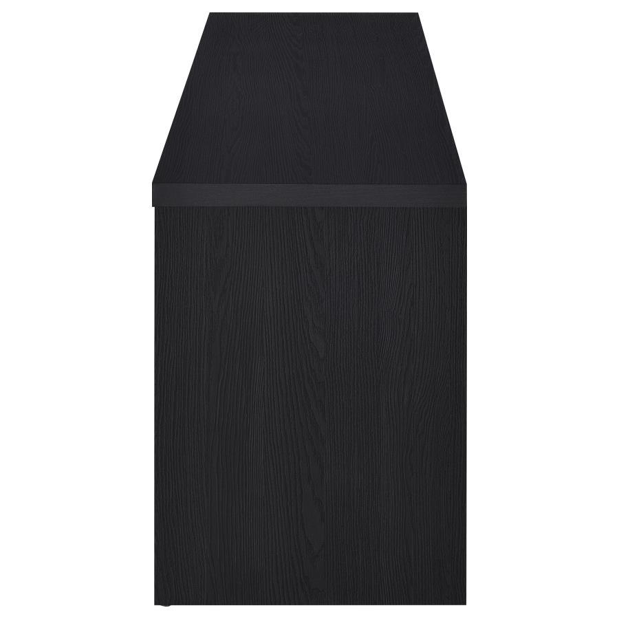 This modern entertainment center combines a sleek TV stand with two matching media towers, offering style and functionality. Finished in a bold black with a scratch-resistant eco-friendly laminate veneer, this unit provides ample storage and display options. The TV stand features cabinets, an open shelf with cable management, and a wide drawer, while each media tower includes open shelves and a bottom cabinet for organized storage. Perfect for creating a cohesive entertainment space in any living room.
